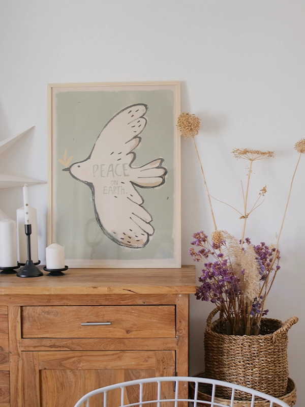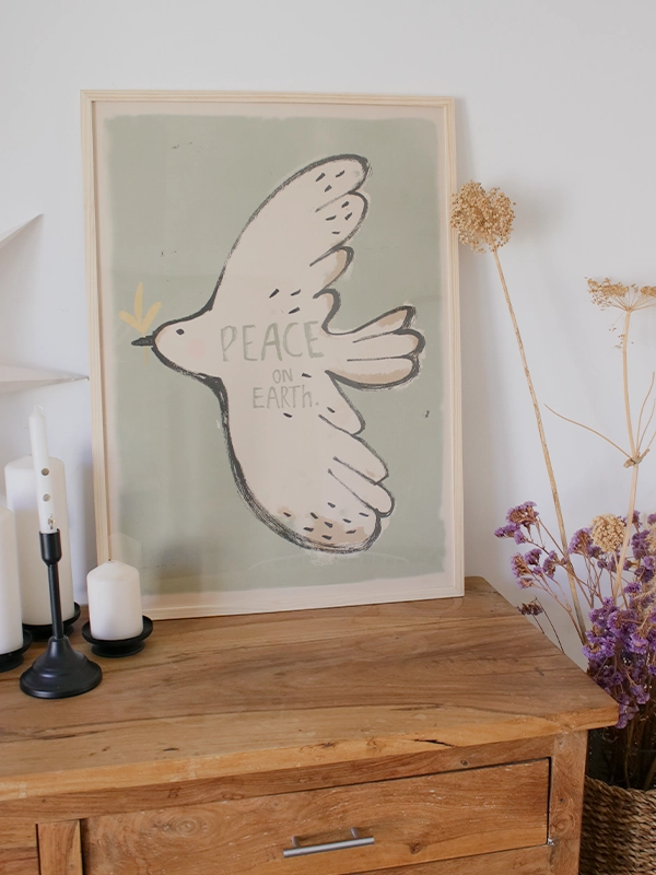 Porteuse d'un joli message "Peace on Earth", cette affiche colombe, symbole de paix embellira votre salon, une chambre.