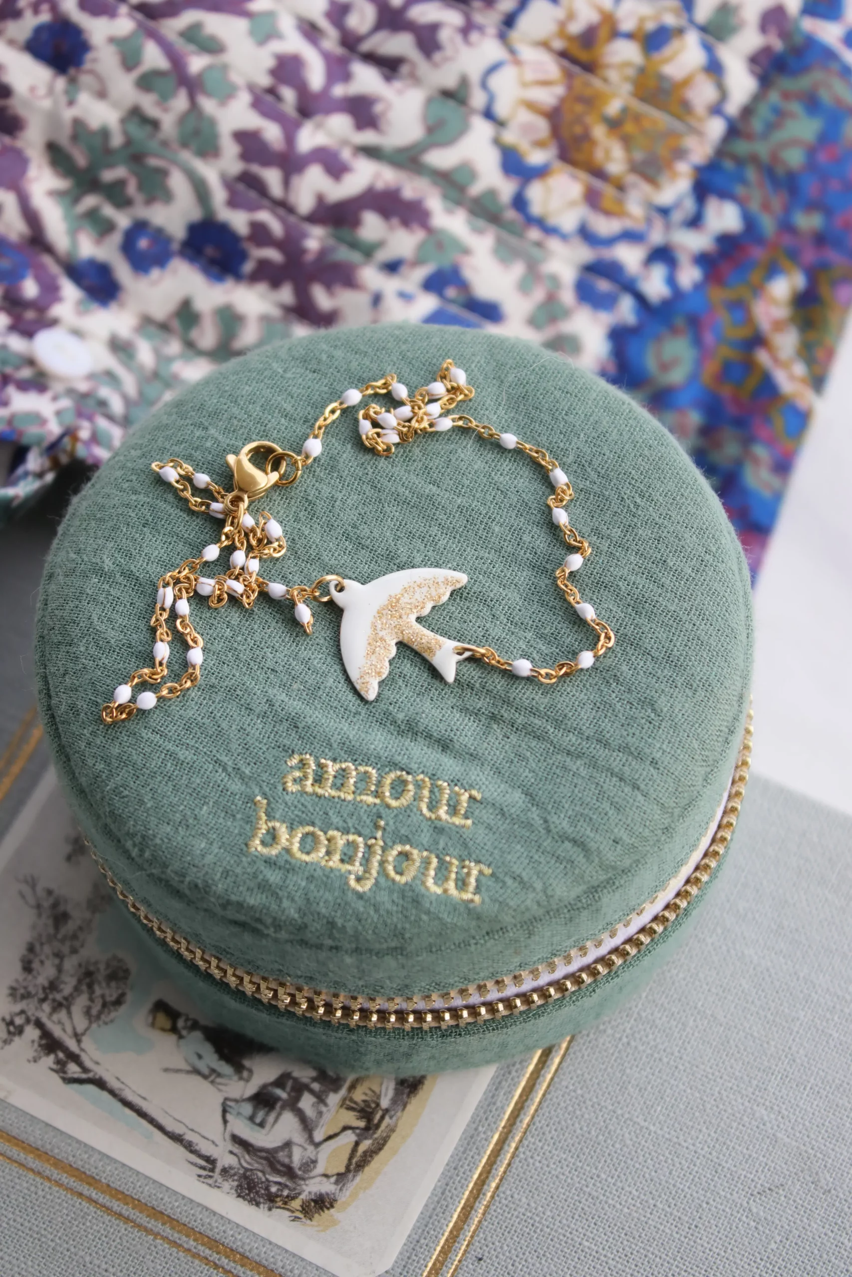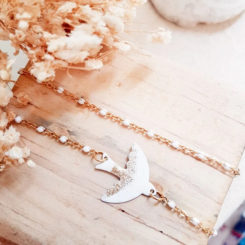 Collier composé d’une chaîne dorée sur laquelle sont intercalées de petites perles blanche et d’un pendentif colombe blanche pailletée.
