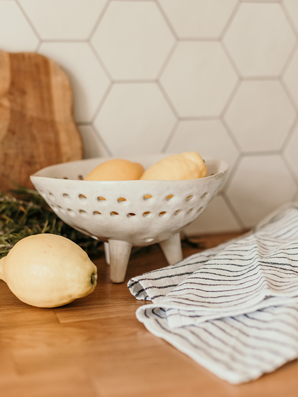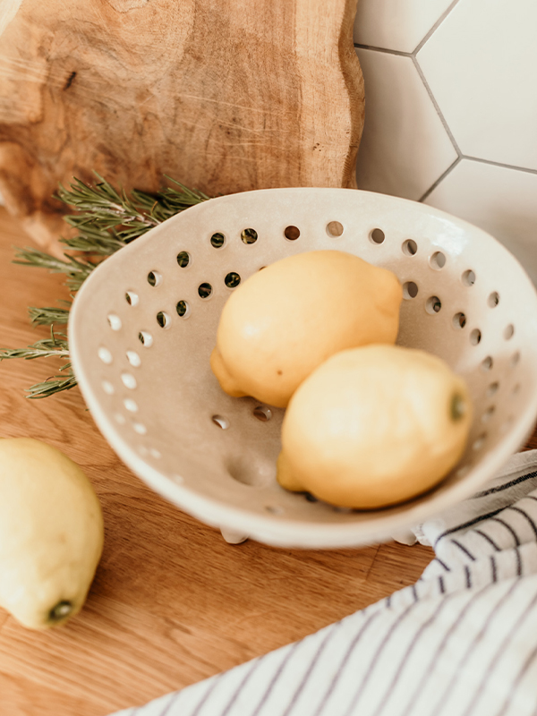 Offrez à votre cuisine une décoration de caractère avec la corbeille iconique en céramique ajourée blanc crème.