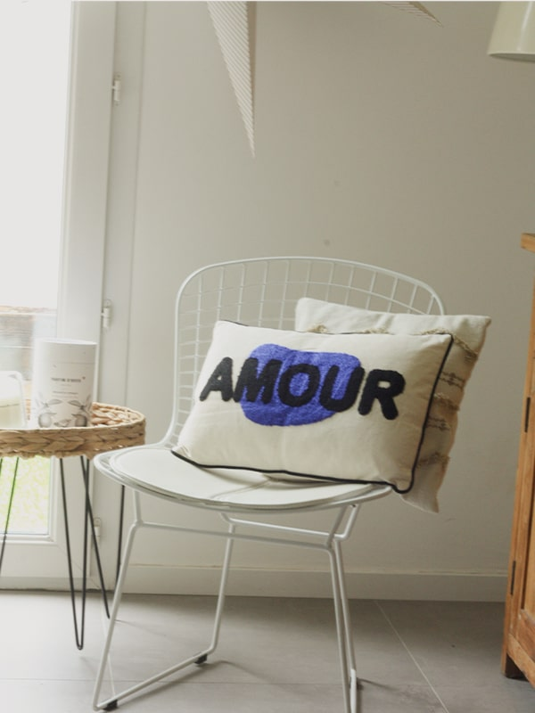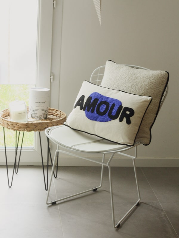 Coussin Amour, 100% coton, empiรจcement bouclette bleu Majorelle et noir