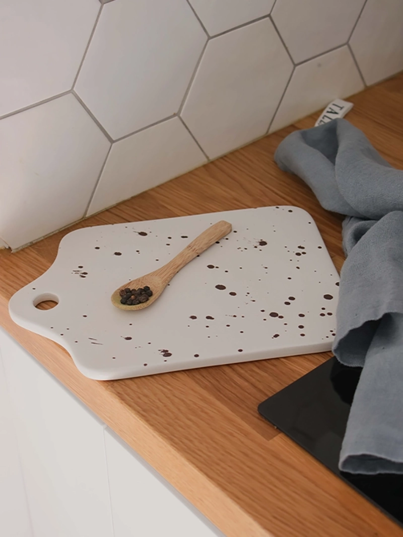 Planche à découper en céramique blanc tacheté inspiration terrazzo, référence PL-TE-16-N0