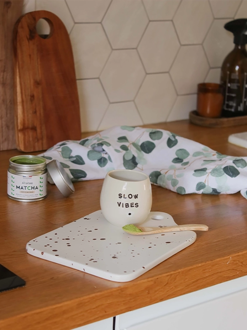 Elle est fabriquée en grès avec des motifs mouchetés marrons réalisés à la main inspirés du terrazzo. Vous pouvez l’utiliser de façon classique pour le découpage lors de vos préparations culinaires.