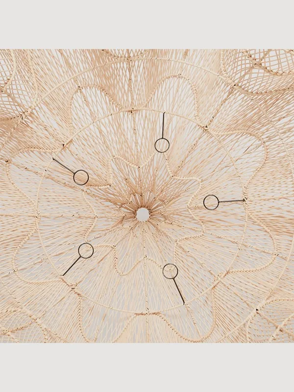 Fabriqué à la main en rotin naturel, chaque pièce est unique. Conçu pour illuminer votre pièce de vie, le lustre contient cinq lumières.