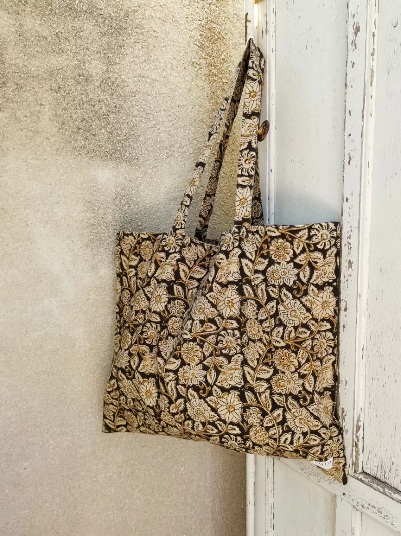 Tote bag indien en coton imprimé Block Print, marron et jaune.